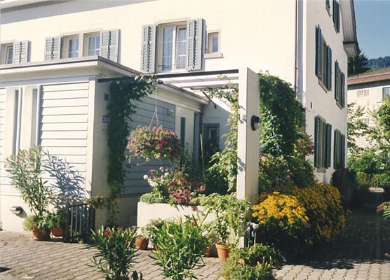 Neuzustand: Vier Familien-Reihenhäuser mit Keller, Erd-, Ober- und Dachgeschoss. Die meisten Vorteile und die adäquatesten Mietzinsen wies eine kühne Idee auf, die die Umnutzung in vier schmale Reihenhäuser vorsah: ideale Hausgrösse, praktische Grundrissaufteilung mit eigenem Eingang, Gartensitzplatz, Geräteschopf usw. Dies alles technisch durchdacht, liebevoll gestaltet und durch weitgehende Erhaltung der Bausubstanz zu sehr günstigen Kosten.