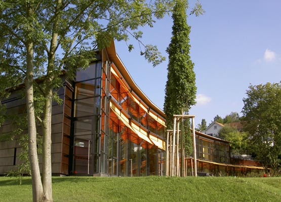 Ein einladender Bau für kirchliche und öffentliche Anlässe, der mit Natur und Umgebung zu verwachsen scheint. Die dunkle Kupferverkleidung des Baukörpers, die sanft geschwungene Glasfront zum Park mit einem markanten talseitigen Abschluss und grosszügigen Einblicken in das farbige Innenleben machen ihn zur Bereicherung eines ganzen Quartiers.
